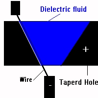 Wire EDM, the technology: The workpiece and the wire represent positive and negative terminals in a DC electrical circuit, and are always separated by a controlled gap, constantly maintained by the machine. This gap must always be filled with a dielectric fluid, in this case deionized water, which acts as an insulator and cooling agent. Of equal importance, it flushes away the eroded particles from the work zone. Sparks are formed through a sequence of rapid electrical pulses, generated by the machines power supply thousands of times per second. Each spark forms an ionization channel under extremely high heat and pressure, in which particles flow between the wire electrode and the workpiece, resulting in vaporization of localized sections The vaporized metallic debris created by this process, from both the workpiece and wire material, is subsequently quenched and flushed away by the flow of dielectric fluid through the gap. As the machine advances the wire through the workpiece, it cuts a slot slightly larger than the wire diameter. Since the wire is also eroded away and used up in this process, the machine constantly feeds new wire into the cut as fresh electrode material.